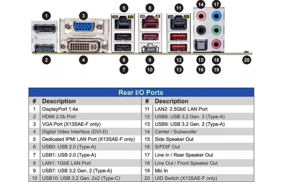 | Motherboard X13SAE-F | Overall | Chipset Intel W680 | LAN Intel i225LM | Video ASPEED AST2600 |